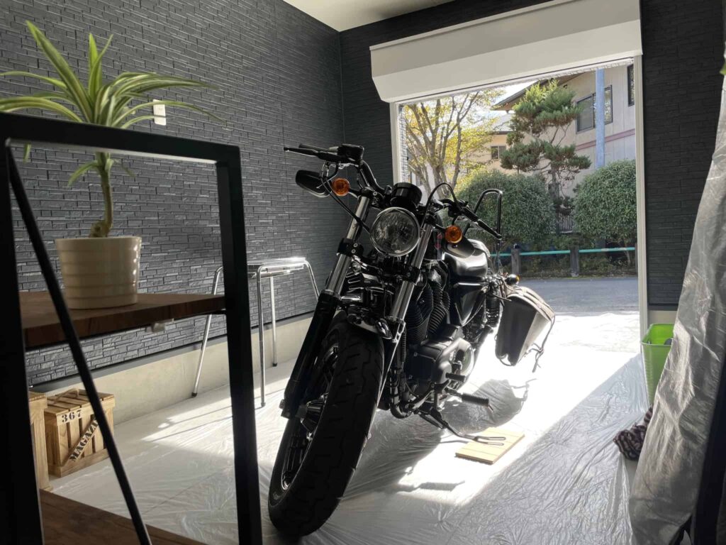 そんな想いから生まれた、バイクガレージ付きの平屋です。建物の一角に設けた専用バイクガレージは、愛車の保管はもちろん、整備やカスタムを楽しむプライベート空間として活躍します。休日には友人が集まり、ガレージがそのままコミュニティスペースに。